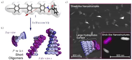 Herein, we will analyze in detail the aggregation process of (S)-1 (Figure 1a) that results in the formation of sheet-like nanostructures (Figure 1b,c). To perform this investigation the computational studies will be guided with our experimentally available data. First, different morphologies of the aggregate will be generated by stacking the monomers in different orientations and, after determining the optimal one, the number of monomer units in the aggregate will be systematically increased. Computational studies on these systems will allow us to analyze the stability of these aggregates and the intermolecular forces involved in the supramolecular assembly—mainly H-bonding and π-π interactions. Additionally, from the obtained geometries it will be possible to calculate the absorption and circular dichroism spectra. A comparison of these data to the experimentally obtained will be performed looking for the best fit to propose a 3D-model for the aggregate.