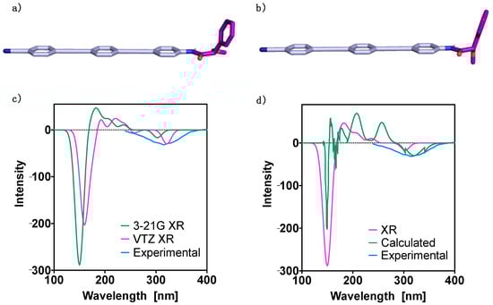 Then, the ECD spectra for the DFT(B3LYP-D3)/6–31G** optimized geometries of the two conformers with significant population at room temperature were calculated and combined considering the conformer contributions to get the final theoretical ECD trace. A comparison between the ECD traces obtained from the theoretical and the experimental studies, in addition to the theoretical spectrum obtained from the X-ray geometry, is shown in Figure 2d. It was found that both TD-DFT(CAM-B3LYP)/3–21G spectra—the one obtained from the conformational studies and the one obtained from the X-ray geometry—are in agreement with the experimental one in the sign of the first Cotton effect, between 300 and 320 nm. Also, the ECD traces obtained from the theoretical and the X-ray geometries show good agreement around 150 nm, while the intermediate regions of the spectra are considerably different. From the DFT(B3LYP)/6311++G(d,p) conformer geometries we evaluated the corresponding ECD spectrum and report the results in the Supplementary Materials, where it is compared to the 6–31G** one. When considering the populations obtained from the Gibbs free energies, only small differences are observed in the spectral bands, that are mainly due to intensity changes in the high energy regions (see Figure S6 in the Supplementary Materials).