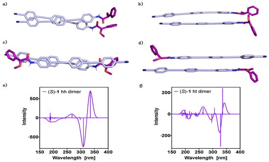 Similar studies were carried out for a dimer of (S)-1 made by the optimized conformers of the monomeric unit. The dimer can be built up in two different ways, head-to-head (hh) (Figure 3a,b) or head-to-tail (ht) (Figure 3c,d). The former (hh) was obtained as the most stable structure, with an energy difference with respect to the latter (ht) of 2.2 kcal mol−1 (see Table 1). This large energy gap implies a significant difference in population of the hh with respect to the ht aggregate at room temperature, indicating a negligible contribution of the ht-conformer to the ECD spectra. Additionally, using the counterpoise correction, we evaluated the DFT(B3LYP-D3)/6–31G** interaction energies for the hh and ht dimers, obtaining values of −24.2 kcal mol−1 and −21.8 kcal mol−1, respectively. This corroborates the larger stability of the hh dimer compared to the ht one. To counterpoise correct the results is important, accounting the corrections to 12.5 kcal mol−1 and 10.1 kcal mol−1 for the hh and ht dimers, respectively. The results of the analysis of the non-covalent interactions in the hh-dimer are reported in the Supplementary Materials (Figure S4) and show that van der Waals forces clearly dominate the non-covalent interactions. These results are in agreement with the van der Waals surface shown in Figure 1a, defined as that with an electron density equal to 0.001 au, and where the molecular electrostatic potential plotted reflects the electrostatic contribution to possible intermolecular interactions [70].