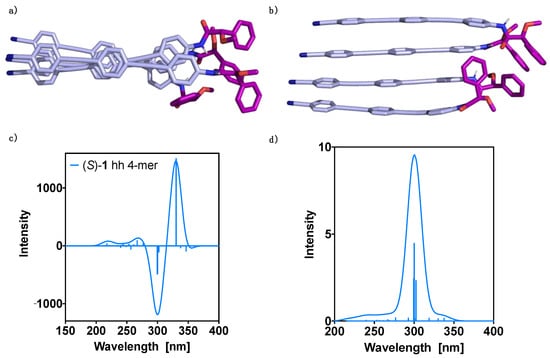 Oligo(phenyleneethynylene) (OPE) (S)-1 hh 4-mer DFT(B3LYP-D3)/6–31G** optimized structure: (a) perpendicular view and (b) parallel view. TD-DFT (CAM-B3LYP)/3–21G spectra evaluated at the DFT(B3LYP-D3)/6–31G** optimized geometry: (c) ECD and (d) UV-Vis. No correction factors are included in the theoretical wavelengths.
