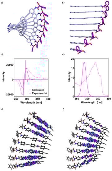 Oligo(phenyleneethynylene) (OPE) (S)-1 hh 8-mer structure: (a) perpendicular view and (b) hh parallel view. TD-DFT (CAM-B3LYP)/3–21G spectra: (c) ECD and (d) UV-Vis. The corresponding experimental spectra are plotted for comparison. No correction factors are included in the theoretical wavelengths. Electron density differences (purple color negative and blue positive, isovalue = 0.0002) for transitions: (e) S0 → S7 and (f) S0 → S9.