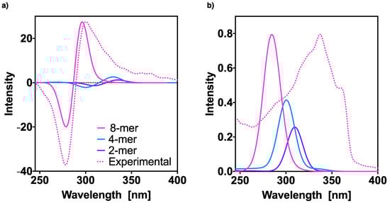 Finally, Figure 6 summarizes all the above results and compares the different aggregate spectra previously obtained for: the dimer, tetramer and octamer of [(S)-1]n (n = 2, 4, 8). The experimental results for the polymer are also provided. We can observe that as n increases, the spectra undergo a bathochromic shift (to lower wavelengths). The ECD spectrum of the dimer and that of the tetramer show three Cotton effects already with a first positive Cotton band, whereas in the case of the octamer only a bisignate, which perfectly reproduces the experimental spectrum, was obtained.