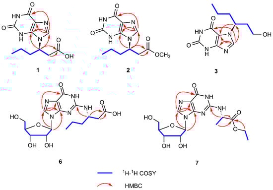 Key 1H-1H COSY and HMBC correlations for 1–3 and 6, 7.