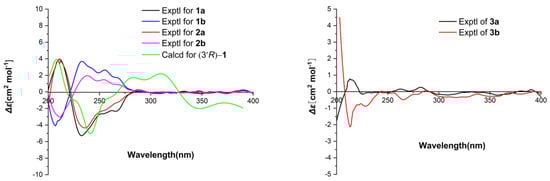 Comparison of the calculated ECD spectrum for (3ʹR)-1 at B3LYP/6-311g(d,p) level with the experimental spectra of 1a, 1b, 2a, 2b in MeOH (left), σ = 0.2 eV, shift = −10 nm. The experimental spectra of 3a,3b in MeOH (right).