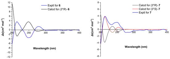 Comparison of the calculated ECD spectrum for (3″R)–6 with the experimental spectrum of 6 at B3LYP/6-31(d,p) level in MeOH (left). σ = 0.3 eV, shift = +5 nm. Comparison of the calculated ECD spectra for (3″R)–7 and (3″S)–7 with the experimental spectrum of 7 at B3LYP/6-31(d,p) level in MeOH (right). σ = 0.16 eV, shift = 0 nm.