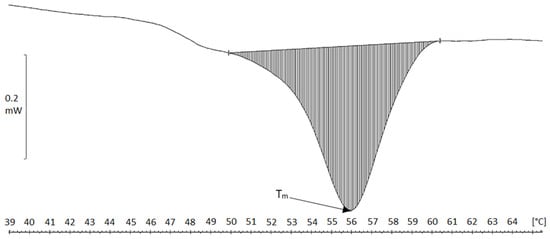 Collagen fibers precipitated in acid solution were characterized by Tm of 45.5 °C and 46 °C, and a single transformation occurred in the thermograms in the temperature range 37–51 °C (Figure 1). The fibers obtained in neutral conditions by the dialysis of collagen solution against a phosphate buffer showed higher transformation temperatures Tm, which were close to 56 °C (transition range 52–60 °C) (Figure 2), thus indicating higher thermal resistance in contrast to that found for acidic fibers. The production of collagen neutral fibers with higher thermal stability is important, as it facilitates the drying or freeze-drying processes (higher temperatures treatment) as well as the use of atelocollagen fibers to create matrices for bioengineering applications [27].
