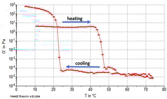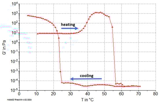Characteristics of phase transformations of reconstituted collagen fibers during heating and cooling were determined based on the storage modulus G′ value (characterizing elastic properties of the material). The results showed that G′ was dependent on the type of raw material pretreatment (PG extraction). In the case of collagen after treatment in NaCl solution, during heating above 32 °C, an increase in G′ value was observed (Figure 3). This transition, although dependent on temperature change, was similar to the aggregation of collagen microfibrils to create gel at temperatures of 32–37 °C, i.e., below the denaturation temperature according to Forgacs et al. [30] and Yang et al. [31]. An increase of elastic properties and G′ value may also be caused by significant inhomogeneity in the gel structure, consisting of different concentrations of collagen fibrils at temperatures below the denaturation temperature (37 °C) [32]. Our results showed an increase of G′ before unfolding the collagen molecules in the range 37–46 °C (Figure 3). After that, at approximately 52 °C, the main phase transition was observed, which involved thermohydrolysis (gelatinization) and a related reduction of G′ to very low levels. This transformation completed at 56 °C (Figure 3).