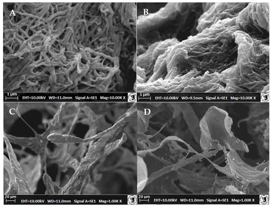 Electron microgram SEM of (A) reconstituted atelocollagen fibers (neutral solution at pH 7.4) isolated from chicken keel cartilage after preliminary proteoglycan extraction with NaCl solution; (B) isolated from chicken keel cartilage after extraction with MgCl2 solution; (C) freeze-dried preparations of reconstituted collagen fibers obtained in a neutral solution at pH 7.4; isolated from cartilage after preliminary extraction of proteoglycans with NaCl solution; (D) from cartilage after extraction of proteoglycans with MgCl2 solution.