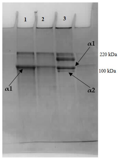 SDS–polyacrylamide gel electrophoresis of atelocollagen fibers isolated from chicken keel cartilage after preliminary proteoglycan extraction with (1) MgCl2 solution; (2) NaCl solution; (3) collagen type I (Sigma Aldrich).