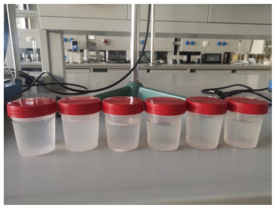 The appearance of the in situ gels prepared. Gel formulations N1–N6 (left to right).