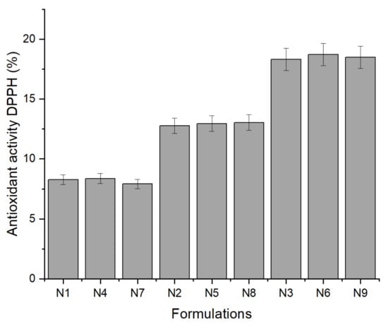 The results have shown that there was no difference between the formulations with the same amount of RJ, and empty gel formulations did not possess the antioxidant activity. In the formulations with 0.5% of RJ (N1, N4, and N7), the antioxidant activity was the lowest. In the formulations with 0.75% of RJ (N2, N5, and N8), the antioxidant activity was significantly higher (p < 0.05). In the formulation with 1% of RJ, the antioxidant activity was the highest, and it did not significantly differ from 1% RJ suspension, which was evaluated prior to the preparation of the in situ gels (p > 0.05). The formulations with pure 10-HDA (N10, N11, and N12) did not possess the antioxidant activity, the reason being that pure 10-HDA did not show high antioxidant activity when measured prior the production of the in situ gel formulations, and the antioxidant activity of royal jelly is attributed to other biologically active compounds [29].
