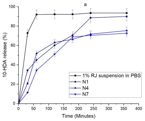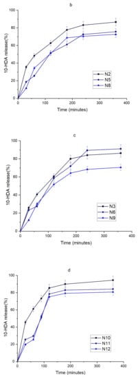The formulation with 1% RJ suspension was used as the control in order to evaluate the modified release profiles of in situ gels. The maximum amount (93.376%) of 10-HDA from 1% RJ suspension was released after 60 min. The maximum amount of 10-HDA from all in situ gel formulations was released after 6 h. There was no significant difference between the percentage of 10-HDA released from the formulations N1–N3 (p > 0.05). The amount released from the in situ gel N6 was statistically significantly higher (91.114%) in comparison with gels N4 and N5 (75.358 and 75.647%, respectively) (p < 0.05). There was no statistically significant difference between the amounts of 10-HDA released from the formulations N7–N9 (p > 0.05). From the formulations with pure 10-HDA N10, N11, and N12, the amount of 10-HDA released was 80.862, 84.211, and 94.535%, respectively. The in vitro release experiments have shown that when the amount of P407 in the in situ gel increased, the total amount of 10-HDA released after 6 h from the formulations was significantly lower (p < 0.05). In situ gels with a higher amount of P407 also possessed higher viscosity. The highest amount of 10-HDA was released when the amount of P407 in the formulations was the lowest (p < 0.05).