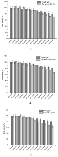 The results of cell viability after 24 h incubation and exposure to the in situ gels have shown that the cell viability depends on the concentration of RJ and 10-HDA in the formulation. In situ gels N1, N4, and N7 had 0.5% (w/v) of RJ in their composition, and they have not impacted cell viability when applied 5-60 µL/well (p > 0.05). Using the amounts of 70–100 µL, the cell viability decreased significantly, from 86.14 to 70.48% (p < 0.05). In situ gels N2, N5, and N8, with 0.75% (w/v) of RJ in the composition, have not significantly changed cell viability at the amounts 5–50 µL/well (p > 0.05). Using 60–100 µL/well, cell viability decreased from 85.37 to 67.38% (p < 0.05).