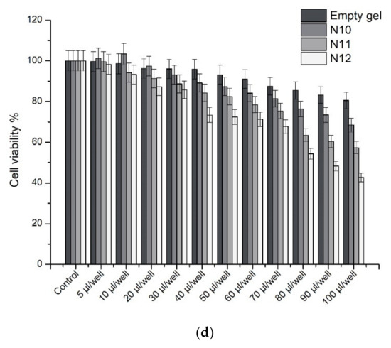 The empty gel did not have a significant effect on the decrease of cell viability when using the amounts 5–60 µL/well (p > 0.05), and using the amounts 70–100 µL/well decreased the cell viability from 91 to 80.53% (p < 0.05).