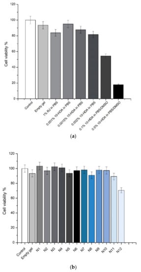 After the evaluation of cell viability after 24 h with pure 10-HDA, all of the in situ gels were exposed to cells, and their viability was assessed after 24 h of exposure. The results are shown in Figure 5.