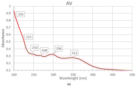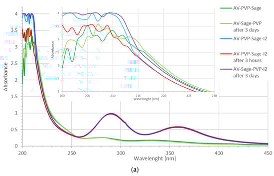 The analysis reveals the same pattern like in our previous investigation of the AV-PVP-I2 biohybrid (Figure 5) [31]. The compounds AV-PVP-Sage and AV-PVP-Sage-I2 absorb at the same wavelengths (Figure 6a,b).