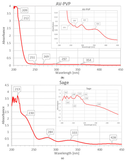 The Sage extract contains compounds, which absorb also in the same range of AV biomolecules [20,24,28]. The addition of PVP leads to incorporation of Sage biomolecules into the PVP polymer matrix verified by the hypochromic shift towards lower intensities (Figure 4d). The pure Sage sample reveals a high intensity absorption band around 200–230 nm, followed by a broad shoulder around 230–50 nm and another a broad band from 260 to 300 nm (Figure 4c). Lower intensity absorption bands appear finally at 310–480 nm and 400–450 nm (Figure 4c). According to previous studies these bands can be assigned to Sage biomolecules [24,28].
