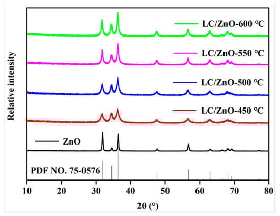 Figure 1 shows the XRD patterns of LC/ZnO composites at different calcination temperatures. As can be observed from Figure 1, the characteristic diffraction peaks of ZnO at 2θ of 31.7°, 34.4°, 36.4°, 47.5°, 56.7°, 62.9°, 66.4°, 67.9°, and 69.2° are consistent with those of the standard ZnO (PDF No. 36-1451) card, indicating that the crystal forms of both the prepared ZnO and the ZnO in the composite materials belong to hexagonal wurtzite [28,29]. In addition, no other XRD peaks are found in the XRD pattern of ZnO, indicating that there are no impurities in the prepared ZnO samples. With the gradual increase in the calcination temperature, the diffraction peaks of the metal oxide in the composite material become sharper, indicating that the increase in the calcination temperature is conducive to the formation of oxide crystals. In addition, with the addition of lignin carbon, although the XRD characteristic diffraction peaks of metal oxides in the composite material have changed, the main peak shape has not changed. It shows that LC/ZnO is successfully synthesized, and the addition of lignin carbon does not change the structure of the metal oxide. Moreover, the XRD pattern of the LC/ZnO composite material does not show an obvious diffraction peak of lignin carbon, which is because the lignin carbon mainly exists in the composite material in an amorphous structure.