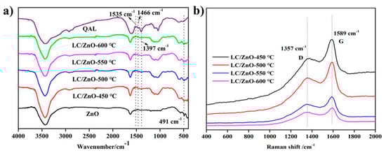 Figure 3 shows the FT-IR and Raman spectra of LC/ZnO at different calcination temperatures. Figure 3a shows the infrared spectra of LC/ZnO at different calcination temperatures. The peak at 1535 cm−1 is the stretching vibration of C=O in the aromatic ring [28], the peak at 1466 cm−1 corresponds to the stretching vibration of the C-OH bond in the aromatic ring [30], and the peak at 1397 cm−1 corresponds to the stretching vibration of the C-H bond in the alkyl group. Comparing the composite material with the uncarbonized QAL, it is found that the peaks of C=O, C-OH, C-H, etc. in the lignin disappear, indicating that the lignin is carbonized. In addition, the infrared spectrum of LC/ZnO is similar to that of ZnO alone. ZnO alone has a characteristic peak of Zn-O bond at 491 cm−1, and the peak of 491 cm−1 exits in the infrared spectrum of LC/ZnO, indicating that LC/ZnO has been successfully made. Moreover, with the increase in the calcination temperature of the composite material, the peak of 491 cm−1 in the infrared spectrum of LC/ZnO becomes more and more obvious, indicating that increasing the temperature is beneficial to the formation of Zn-O. Figure 3b is the Raman spectra of LC/ZnO at different calcination temperatures. It is known that the peak at 1357 cm−1 is the D peak, which indicates the presence of disorder and defects in the carbon structure. Additionally, the peak at 1589 cm−1 is the G peak, which reflects the presence of disordered sp2 hybrid carbon in the carbon structure. ID/IG (intensity ratio) is generally used to estimate the degree of disorder in sp2 hybridized carbon regions [12]. The higher the ID/IG is, the higher the degree of disorder. According to the Raman spectrum, the ID/IG of LC/ZnO-450 °C, LC/ZnO-500, LC/ZnO-550 °C, and LC/ZnO-600 °C are 0.765, 0.769, 0.784, and 0.786, respectively. As the temperature increases, ID/IG also increases, indicating that the sp2 hybrid carbon region becomes more disordered under higher temperature conditions, and more defects are formed, which is not conducive to the study of electrochemical performance.
