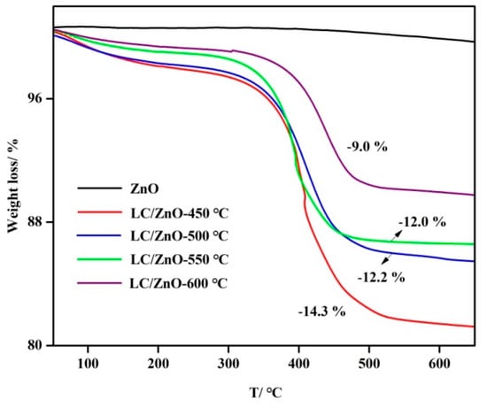 Figure 4 shows the TG graphs of LC/ZnO at different calcination temperatures. It can be seen from the figure that lignin pyrolysis is basically divided into three stages. The first stage is the removal of free water below 200 °C. The second stage is the significant weight loss caused by the breakage of a large number of functional group branches connecting the phenylpropane structure at 200–500 °C. The third stage is the condensation polymerization and rearrangement of the benzene ring above 500 °C. The carbon content of LC/ZnO at different calcination temperatures is 14.3% (LC/ZnO-450 °C), 12.2% (LC/ZnO-500 °C), 12.0% (LC/ZnO-550 °C), 9.0% (LC/ZnO-600 °C), respectively. It can be observed that as the calcination temperature increases, the carbon content in the composite material gradually decreases. This is because lignin is easily decomposed at high temperatures. Therefore, the higher the calcination temperature is, the lower the content of the lignin.