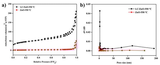 Nitrogen adsorption and desorption isotherms and pore size distribution of LC/ZnO-550 °C and ZnO-550 °C: (a) nitrogen adsorption and desorption isotherms; (b) pore size distribution.