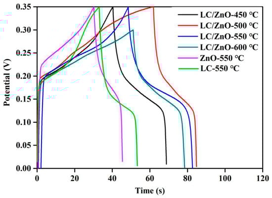 Figure 7 shows the GCD curves of LC/ZnO at different calcination temperatures, ZnO and LC at 0.1 A/g. It can be seen that the GCD curve of LC/ZnO at each temperature shows a clear charge and discharge platform, indicating that a significant oxidation-reduction reaction occurred during the charge and discharge process. This result is consistent with the analysis result of cyclic voltammetry. According to Formula (5), the weight-specific capacitances of LC/ZnO-450 °C, LC/ZnO-500 °C, LC/ZnO-550 °C, and LC/ZnO-600 °C are calculated as 65 F/kg, 81 F/kg, 101 F/kg, and 92 F/kg, respectively. It can be inferred that the weight-specific capacitance of the composite material shows a trend of first increasing and then decreasing as the temperature rises, and the weight-specific capacitance of LC/ZnO reaches the highest at 550 °C. According to Formulas (6) and (7), the energy density and power density of the composite materials are shown in Table 1. The energy densities of LC/ZnO-450 °C, LC/ZnO-500 °C, LC/ZnO-550 °C, and LC/ZnO-600 °C are calculated as 3.98 W·s/kg, 4.96 W·s/kg, 6.19 W·s/kg, and 5.64 W·s/kg, and the power density is 0.173 W/kg, 0.177 W/kg, 0.177 W/kg and 0.176 W/kg, respectively. In addition, the weight-specific capacitance of LC/ZnO-550 °C is 2.3 times that of ZnO-550 °C (43 F/kg) and 1.8 times that of LC-550 °C (57 F/kg). It can be inferred that the combination of lignin carbon and metal oxide can effectively improve the electrochemical performance of each other. This is because they both synergize and promote each other. The metal oxide protects the lignin from being decomposed, and lignin increases the specific surface area and pores of metal oxides.