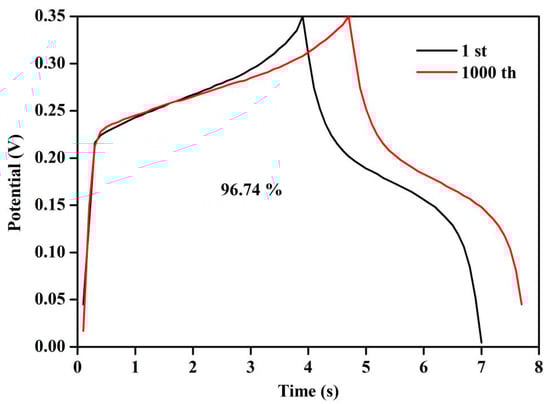 In this thesis, the GCD of the LC/ZnO-550 °C was carried out several times under the current density of 1 A/g to study its cycle performance. Figure 9 shows the GCD curve of LC/ZnO-550 °C at the 1st and 1000 cycles. It can be seen that after 1000 times of charging and discharging, the capacitance retention rate reached 96.74%. In addition, after 1000 cycles, the GCD curve of LC/ZnO-550 °C maintains the same shape as the first time, indicating that LC/ZnO-550 °C has good cycle stability.