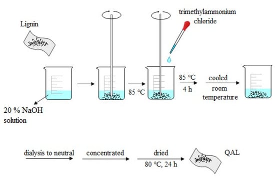 As shown in Figure 10, 9.02 g of alkali lignin was dissolved in 20% NaOH solution, stirred for 30 min, and heated to 85 °C; then, 7.51 g of trimethylammonium chloride was added drop by drop, kept at 85 °C for 4 h, and then cooled to room temperature. The cooling product was transferred to a dialysis bag for dialysis to neutral. After that, the dialysis product was concentrated at 80 °C to viscous and dried at 80 °C for 24 h to obtain the activated product of alkali lignin, which was denoted as QAL.