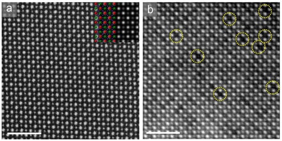 As shown in the HAADF images in the [001] direction in Figure 3, in contrast with the uniform square lattice of the pristine non-quenched electrolytes, vast vacancies appear in the 1300 °C quenched samples, highlighted by yellow circles. The simulated HAADF image in the Figure 3a inset shows the dark atoms correspond to the green La atoms in the superposed structural model. This confirms that vast La atoms move out of the original A1 layer and leave vacancies in the samples when quenched at high temperatures. Therefore, a rearrangement of La lattice atoms has occurred where La atoms within the A1 plane migrate into the “empty” A2 layer, behaving as the obvious “interstitial” defects in Figure 2c. From the serial images Figure 2a–c, it is also reasonable to propose that the regular “interstitial” defects (in Figure 2c) could be a metastable configuration in the La migration.