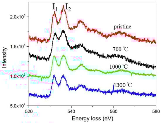 The LaA1→LaA2 transition not only generates the emerging of the metastable configurations, but also creates a new chemical environment and coordination structure of the O ligands which can be detected by energy loss spectrum near-edge fine structures (ELNES). As shown in Figure 6, the K edges of O atoms (1s→final state) with double peaks, denoted as I1 and I2, demonstrate obvious variations in differently quenched samples. The double peaks in the O K-edge are mainly caused by t2g and eg splitting due to hybridization of unoccupied O 2p orbitals with Nb 3d0 orbitals [] in the crystal field of octahedral O-ligands surrounding Nb. From the atomic structure characterization in Figure 2 and Figure 4, the samples quenched at 1000 °C contain both perfect lattice and diverse precipitated defects, acting as an intermediate mixture of the pristine and 1300 °C-quenched samples. Although no obvious chemical shift occurs at the O K-edges, the intensity ratio of double peaks (I1/I2) increases with the quenching temperature. This indicates us that the metastable LaA2 configuration contributes to the high I1/I2 ratio. As most O atoms reside outside of the A2 planes and are less coordinated with La after the LaA1→LaA2 transition, this indicates a higher unoccupied density of states of the hybridized eg orbitals. Besides the ELNES of O, the M2,3 edges of Nb also present variations when the quenching temperature increases (Figure S5), resulting from atomic migration and coordination rearrangement.