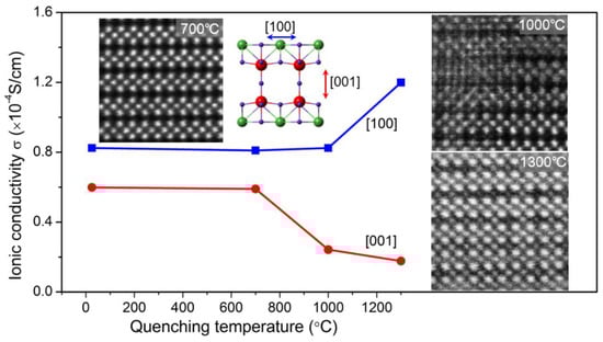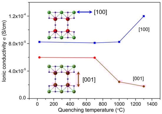 In the LLNO electrolytes, vast La vacancies within the A1 layer emerge and the LaA1→LaA2 transition occurs under high-temperature annealing/quenching. This will give rise to the enhancement of the in-A1-plane ionic conductivity, since part of LaA1 moves out of the Li migration pathways. In contrast, the out-of-A1-plane (perpendicular to A1 plane) Li ion transport would be partly blocked due to the presence of LaA2 interstitial defects (Figure 2c). As seen in Figure 7, the conductivity in the [100] direction (in-A1-plane) increases by almost one order of magnitude to 10−4 S·cm−1, while the conductivity in the [001] direction (out-of-A1-plane) decreases by three times as the quenching temperature increases. Note the measurements are all conducted on quenched single-crystal electrolytes. As a solid electrolyte, LLNO is an electronic insulator, and its macroscopic ionic conductivity is dominated by mobile ions with small radii such as Li+. In our EELS measurement, we did not detect any local reduction of the valence state of Nb5+ in the single-crystal LLNO, which avoided the appearance of electronic conductivity. Local minor oxygen vacancies may exist and compensate the small amount of Li deficiency induced by the heat treatment. It is well known that oxide-ion conductivity usually appears at elevated temperatures []. We suppose that oxide ion conductions in the quenched LLNO samples hardly contribute to the total conductivities at room temperature.