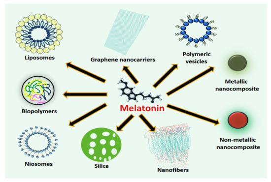 The use of melatonin-loaded nanostructures represents a promising therapeutic strategy. After being incorporated or adsorbed into solid lipidic, biopolymers or polymeric vesicles, silica NPs, nanofibers, graphene nanocarriers, and metallic or non-metallic NPs, melatonin is thought to achieve superior biological effects due to molecular protection and sustained release. These drug-delivery systems may be considered as an important approach to facilitate the permeability of the chemical agent while maintaining systemic safety during the treatment of complex pathologies and disease conditions.
