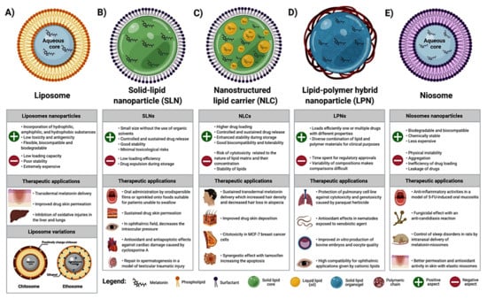 Structural representation of lipid nanosystems, main characteristics, and therapeutic applications of melatonin into liposomes (A), solid lipid NPs (SLN) (B), nanostructured lipid carriers (NLC) (C), lipid-polymer hybrid NPs (LPN) (D), and niosomes (E). Image was created using Biorender.com. Access in February 2021.