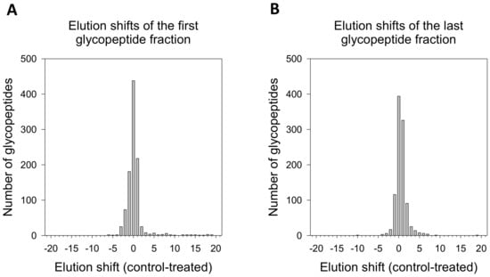 Global analysis of glycopeptide elution shift due to treatment-induced glycosylation. The shift was separately calculated for each glycopeptide. The first (A) and last (B) glycopeptide fractions are the first and last fractions in which the analysed glycopeptide was identified.