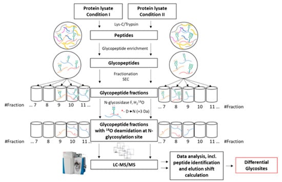 Differential glycosite profiling strategy. Membrane protein lysates underwent enzymatic digestion using a combination of Lys-C and trypsin followed by glycopeptide enrichment. Samples enriched in glycopeptides were then fractionated on SEC into 20 fractions. Each fraction was deglycosylated using N-glycosidase F in 18O-water to ensure a +3 Da shift during the deglycosylation-induced deamidation of asparagine. Furthermore, each fraction was analysed by mass spectrometry (LC–MS/MS). Through complex data analysis, which led to a comparison of the elution times of the same glycopeptides in both conditions, differential glycosites were identified.
