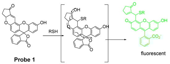 Michael addition is one of the most commonly used strategies for detection of thiols. Michael addition reaction has a high selectivity for thiols though it can also occur with other nucleophiles such as -OH, NH, or -COOH. Xiaoqiang Chen et al. [34] published their work on the development of a thiol imaging tool bearing fluorescein as the fluorophore (Probe 1). As shown in Figure 3, the process of turning on the fluorescence starts from a 1,4-addition of thiols to the α, β-unsaturated ketone in the probe. Subsequent spiro ring opening of fluorescein lights up the fluorescence (Ex. 485 nm, Em. 520 nm) which provides fluorescence enhancement by 61-fold compared with probe itself. The probe exhibits a similar fluorescence enhancement towards Cys, Hcy, and GSH. With fluorescein as a standard, the quantum yields of the thiols adducts with probe were determined to be 0.65, 0.91, and 0.47 for GSH, Cys, and Hcy, respectively. The probe is featured with a rapid response and high sensitivity with a detection limit of 10−7–10−8 M. Further, the probe was proved to be capable of detecting the thiol status change in live P19 cells. More importantly, the probe is also the first reagent being used to monitor the thiols status in zebrafish. A significant fluorescence intensity decrease was observed when the cells or zebrafish were treated with a thiol trapping reagent, N-methylmaleimide (NMM) (40–50 μM).