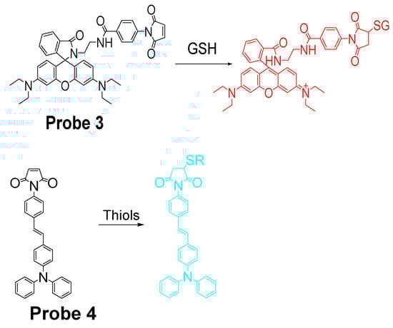 It is known that maleimide can react selectively toward thiols than other nucleophiles via a Michael addition reaction. In the meantime, maleimide can also serve as a fluorescence quencher in their conjugated form. Thus, maleimide has been widely utilized by many groups to build the thiols selective probes. For instance, in 2017, Hai Shu et al. [71] reported a rhodamine B-based probe (L1, Probe 3) with maleimide serving as a thiol recognition unit. Upon reaction with GSH, the probe can be turned on from non-fluorescent to a strong fluorescent thiol-rhodamine adduct (586 nm) due to a Michael addition reaction followed by a spirolactam ring opening (Figure 5). A more than 200-fold increase of fluorescence intensity was observed when excessive GSH was added. In addition, the fluorescence intensity was found to be linearly increased with an increase in GSH (2–26 μM) with a detection limit of 0.219 μM. The probe shows a high selectivity toward GSH than other thiols. Further, cellular experiments demonstrated that L1 can be used to monitor intracellular GSH in HepG-2 and HUVEC cells. Another similar approach was reported by Tao Liu et al. [72] in 2016 for selective detection of thiols in live cells with a high sensitivity (Probe 4). The detection limits were determined to be 0.085, 0.12, and 0.13 μM for GSH, Hcy, and Cys, respectively. Similarly, the probe was also successfully applied in the determination of intracellular GSH in live HepG2 cells.