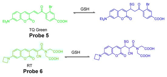 In contrast to traditional fluorescent methods, reagents which can detect a thiol in a reversible manner was developed. In 2015, Xiqian Jiang et al. [73] reported a reversible and ratiometric fluorescent probe-ThiolQuant Green (TQ Green, Probe 5) for quantitative imaging of GSH. The probe is composed of a 7-amino coumarin group as the fluorophore and an aromatic structure to extend the absorption wavelength of coumarin. These two parts are linked together by a thiol reactive group, Michael acceptor. The probe’s reaction with GSH is reversible when GSH is depleted. TQ Green (Ex. 488 nm, Em. 590 nm) is turned into to TQ Green-GSH (Ex. 405 nm, Em. 463 nm) upon reaction with GSH (Figure 6). The ratio of signal intensities (absorbance or fluorescence) between TQ Green-GSH and TQ Green is proportional to the GSH concentration enabling the ratiometric detection of GSH with a detection limit of 20 nM. No reaction was observed when the probe was exposed to an excessive ratio of bovine serum albumin (BSA) indicating the probe does not react with PSH. Cellular experiments with multiple cell lines, including 3T3-L1, HepG2, PANC-1, and PANC-28 cells, proved that the GSH concentration obtained from TQ Green live imaging were well correlated with the values achieved from bulk lysate measurements. The probe can well reflect the GSH level changes in live cells when the GSH level was reduced by diethylmaleate (DEM). One drawback of the method is that the reverse reaction between GSH and TQ Green is slow leading to the inability of the probe for a quick detection of a decrease of GSH in live cells.