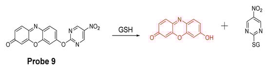 Xilei Xie et al. [81] reported a probe (Res-Biot, Probe 9) in 2017 for selective detection of GSH based on the ether bond. In this approach, pyrimidine moiety was for the first time investigated and optimized as a unique recognition unit for thiols. The pyrimidine moiety was connected with fluorophore resorufin via an ether linkage to generate probe Res-Biot. Upon reaction with a thiol, a high fluorescent resorufin is released with a strong fluorescence at 585 nm (Figure 9). Moreover, the fluorescence intensity at 585 nm was increased proportionally to the concentrations of GSH in a range of 0−20 μM with a detection limit of 0.29 μM. The probe was successfully used to detect a decrease in intracellular GSH concentration down-regulated by an oxidative stress inducer, 12-myristate 13-acetate (PMA), or by L-buthionine sulfoximine (BSO)—an inhibitor of γ-glutamylcysteine synthetase.