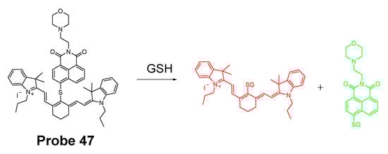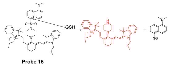 Fluorophores with emission in red or near NIR region have the advantages of low fluorescence background, deeper penetration, and less damages to live cells or tissues [86,87]. In 2014, a cyanine-based fluorescent probe (Probe 15, Figure 14) for highly selective detection of GSH in cells and live mouse tissues have been reported by Jun Yin et al. [88]. The probe utilizes a 5-(dimethylamino)naphthalenesulfonamide group for highly selective detection of GSH over Cys and Hcy. In vitro cellular experiments with HeLa cells proved that the probe was capable of monitoring GSH in live cells. When the cells were pretreated with N-methylmaleimide (NMM, a thiol-blocking agent) followed by treatment with the probe, it showed no red fluorescence while strong fluorescence was observed when no NMM was used confirming that the probe was detecting thiols. In addition, only a minor change of fluorescence intensity was observed when Cys (100 μM) or Hcy (100 μM) was used to the NMM-pretreated HeLa cells. In contrast, significant red fluorescence emission was observed when GSH (100 μM) was added suggesting that the probe can selectively detect GSH in the presence of Cys or Hcy. The probe was successfully applied for monitoring the GSH levels in mouse tissues such as liver, kidney, lung, and spleen.