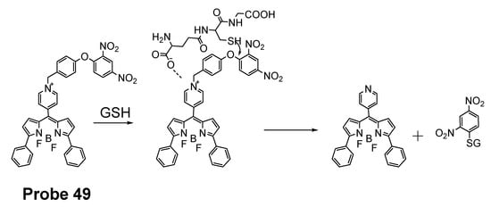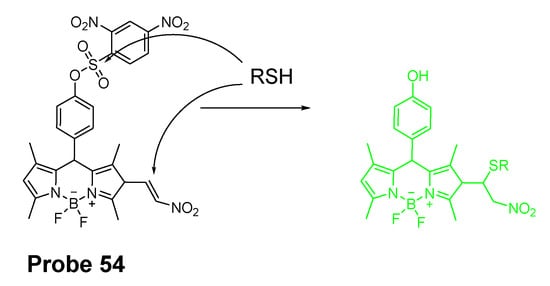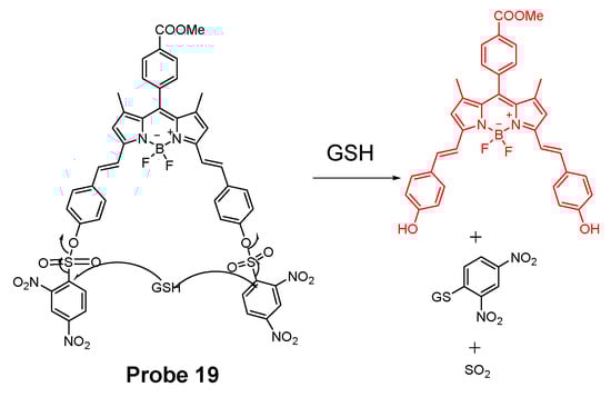 In 2018, Xiang Xia et al. [67] reported a BODIPY disulfonate probe (BODIPY-diONs, Probe 19, Figure 18) with a two-photon fluorescent turn-on effect for discriminately detecting GSH over Cys and Hcy. In the approach, the BODIPY dye was modified by extending the conjugated π-system to achieve a near-infrared emission. The DNBS moiety was utilized as the fluorescence quencher and also the thiol response group. A SNAr process will be initialized when the probe is exposed to GSH, resulting in the cleavage of DNBS and a significant increase of fluorescence (Em. 675 nm). Because of the double DNBS-functionalization, a different reaction rate between the probe and Cys/Hcy vs. GSH was observed with GSH being the fastest one. Later, the probe BODIPY-diONs was demonstrated to be capable of detecting GSH in live cells. In comparison with other reported fluorescent probes, BODIPY-diONs has the advantages of longer emission wavelength and low detection limit of 0.17 μM.