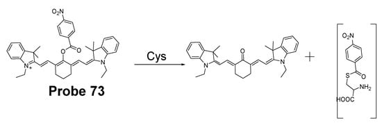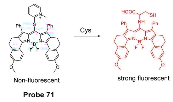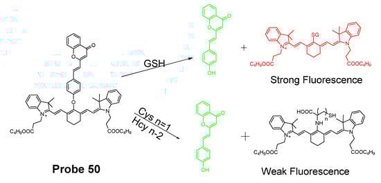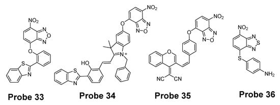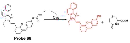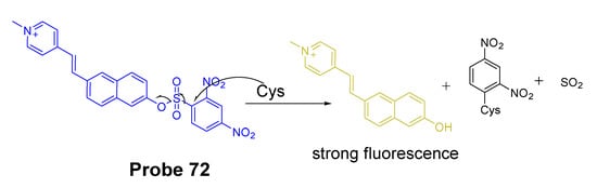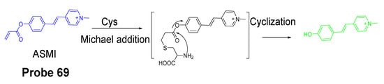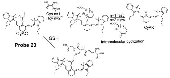 Cyclization of Cys/Hcy with aldehydes or acrylates is one of the most extensively used mechanism for selectively detection of Cys/Hcy over GSH. As mentioned above, a two-step reaction takes place for the selective detection of Cys/Hcy. The method starts with a Michael addition reaction from the thiolate of a thiol (GSH, Cys, or Hcy) to form a thioether. The thioether derived from Cys or Hcy will go through a cyclization to produce a seven members-ring cyclic amide (Cys) or eight-member ring cyclic amide (Hcy) at a different reaction rate while the thioether derived from GSH is not able to undergo the cyclization reaction. Many probes have been designed based on this mechanism to selectively detect Cys/Hcy over GSH (Figure 22). For example, Xiaofeng Yang et al. [99] reported in 2011 a benzothiazole derivative which utilized an α, β-unsaturated carbonyl recognition as the thiol responsive unit to selectively detect Cys.