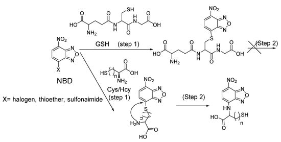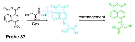 SNAr reaction is another widely used mechanism for imaging thiols in live cells since the thiol group can easily displace a leaving group that is attached to an aromatic ring in a fluorophore by a substitution reaction to form a thioether. These leaving groups include halogen, ether, thioether, etc. To be noted here, SNAr substitution reactions have also been commonly used to discriminatively detect Cys/Hcy due to a rearrangement reaction occurring to the thioether formed in the substitution reaction. The rearrangement reaction only occurs to the thioether derived from Cys and Hcy (Figure 7).