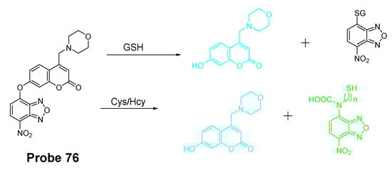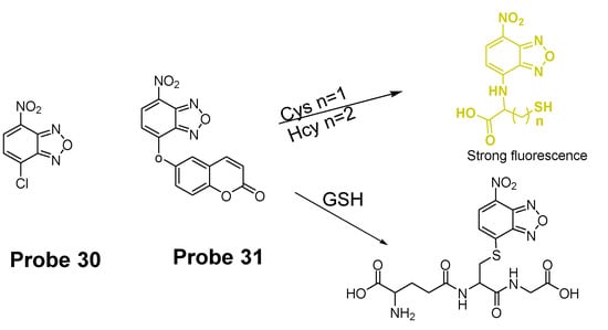 In addition to halogen, other leaving groups, such as ether or thioether are also widely used as a thiol recognition unit for building a thiol selective probe. For example, Xinghui Gao et al. [80] developed a probe (Probe 8) in 2015 for detection of GSH and Cys in different emission channels by connecting 7-nitrobenzofurazan with resorufin through the ether bond in which the ether bond also served as a thiols recognition unit. Reaction with thiols (GSH, or Cys) yields a free strong fluorescent resorufin (Em. 585 nm) and a thiol conjugated nitrobenzofurazan. However, the thiol conjugated notrobenzofurazn derived from Cys will undergo an intramolecular rearrangement to generate a new fluorescent product with λem = 540 nm while the thiol conjugated notrobenzofurazn derived from GSH remained unchanged (Figure 8). Measuring the fluorescence intensity from resorufin (Em. 585 nm) enabled the determination of the total thiols (GSH, and Cys/Hcy) while measuring the fluorescence intensity of both resorufin and the thiol conjugated nitrobenzofurazan provided a method to distinguish GSH from Cys. The detection limits for GSH and Cys were reported to be 0.07 μM and 0.13 μM respectively with a linear relationship between the fluorescence intensity and the concentration of GSH (1–18 µM) and Cys (3.1–90 µM, 1–40 µM), respectively. The probe was employed to detect Cys and GSH in human plasma.