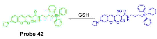 In 2018, Chao Yin et al. [94] developed a ratiometric photoacoustic imaging (PAI) fluorescence probe (Probe 22, Figure 21) for imaging GSH in vivo with a high resolution and deep penetration. The probe, IR806-pyridine dithioethylamine (PDA), employs a disulfide bond as the thiol recognition group and NIR cyanine as the fluorescence report unit. Upon reaction with GSH, the disulfide is cleaved followed by a subsequent intramolecular reaction to form a sulfydryl group leading to a ratiometrically signal changes of NIR-absorption peak from 658 to 820 nm. The detection limit for GSH is as low as 0.86 × 10−6 M. The probe was successfully applied for in vivo ratiometric PAI of upregulated GSH in the tumor of mice.