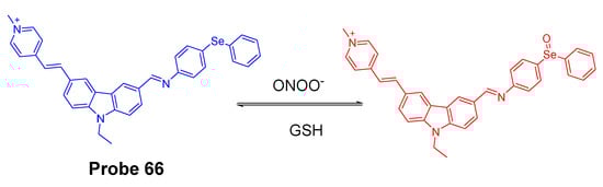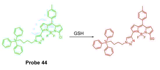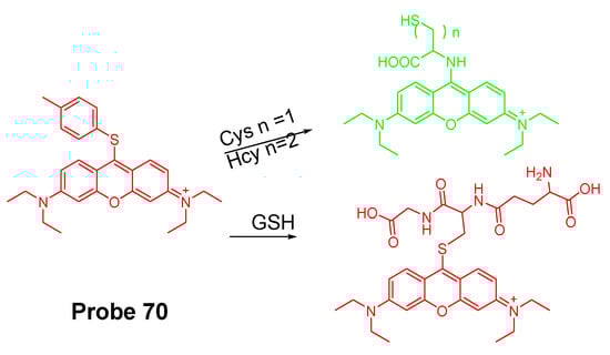 Jing Liu et al. [83] reported a GSH discriminating fluorescent probe (Probe 11, Figure 11) in 2014 based on pyronin B as the fluorophore and thioether as the thiol recognition group. In the approach, A methoxythiophenol group was connected to the fluorescent pyronin moiety to serve as a fluorescence quencher via a photoinduced electron transfer (PET) process. Reaction with thiols (GSH, Cys, Hcy) through SNAr reaction generates a highly fluorescent thiol conjugated pyronin with λem for GSH-pyronin and Cys/Hcy-pyronin at 622 nm and 546 nm respectively due to the additional intramolecular rearrangements of Cys/Hcy. The probe has been successfully applied for simultaneously detection of Cys/Hcy and GSH in B16 cells.
