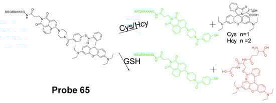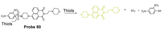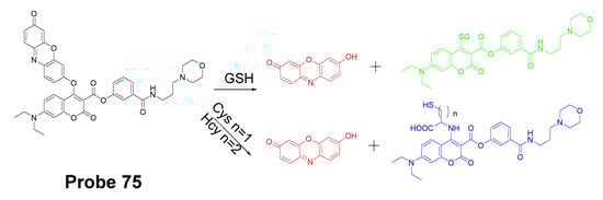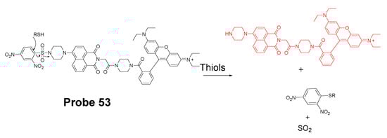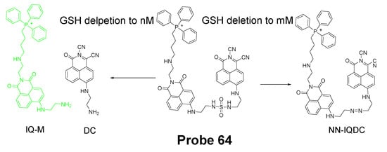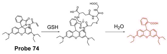 In 2014, Masafumi Yoshida et al. [85] reported a novel cell-membrane-permeable fluorescent probe (Probe 14) for detection of GSH based on the cleavage of sulfonamide as the thiol responsive mechanism. As illustrated in Figure 13, a fluorophore hydroxymethylrhodamine green (HMRG) and a 2,4-dinitrobenzenesulfonyl (DNBS) moiety were combined by a sulfonamide group in the approach. The fluorescence of the probe was quenched by two fluorescence quenching mechanisms, intramolecular spirocyclization (close-ring form of HMRG) and intramolecular PET between HMRG and DNBS. Reaction with a thiol breaks the quenching by cleaving the sulfonamide bond to release a free open-ring high fluorescent HMRG with an up to 7000-fold increase in fluorescence intensity (520 nm) and the increase was proportional to the concentration of GSH around the physiological concentration. The probe was successfully applied for the detection of GSH levels’ change in live cells. Further, the probe was used to detect tumor nodules in tumor bearing mice of SHIN-3 ovarian cancer by taking advantage of the fact that GSH level in tumor tissues is higher than normal tissues.