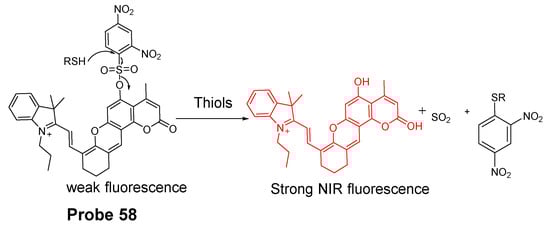 Dicyanomethylene-4H-pyran, one of the fluorophores with emission in red or NIR region, is featured with its better stability than other NIR fluorophores such as cyanine and squaraine. In 2014, Meng Li et al. [61] reported a colorimetric and NIR fluorescence turn-on thiol probe (Probe 17, Figure 16) based on dicyanomethylene-4H-pyran as the fluorophore and 2,4-dinitrobenzenesulfonyl (DNBS) as the thiol recognition group and also as the fluorescence quencher. A benzene unit was introduced to the dicyanopyran to extend its conjugated system to make its emission wavelength into the desired NIR region [90]. The fluorescence of the compound switched from off to on when the DNBS was cleaved by GSH (Ex. 560 nm, Em. 690 nm), and the fluorescence intensity increases linearly as the concentration of GSH increases (1 to 10 μM) with a detection limit of 1.8 × 10−8 M. A similar response was observed for other sulfhydryl-containing compounds such as Cys, Hcy, and dithiothreitol. The probe was applied for imaging GSH in HeLa cells.