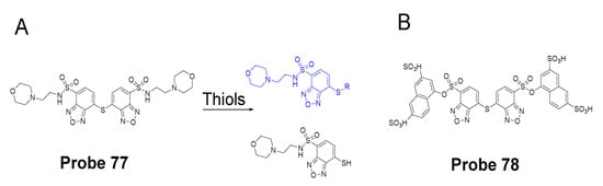 In 2012, Yinghong Li et al. from our group reported a thiol specific probe [42] (GUALY’s reagent, Probe 10) based on a symmetric benzofurazan sulfide for imaging and quantifying total thiols in live cells. The symmetric benzofurazan sulfide was constructed by combining two benzofurazan fluorophores with a thioether group (Figure 10). The probe itself is not fluorescent due to the self-quenching of the symmetric structure but turns into a fluorescent product (Ex. 430 nm, Em. 520 nm) rapidly upon reaction with thiols through a thiol specific thiol–sulfide exchange reaction. GUALY’s reagent has been successfully applied for imaging and quantifying total thiols (PSH+NPSH) in live cells [42,82].