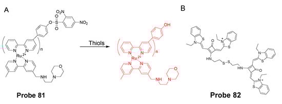 In addition to the thiol detection probes presented above, numerous other thiol detection probes have been developed based on other mechanisms or strategies [30,62,95]. Although not covered in this review, there are also a number of thiol detection probes which were developed based on nanoparticles and nanocomposites, and metal ion displacement and coordination [46]. These different strategies also emerged as promising strategies for detection of thiols.
